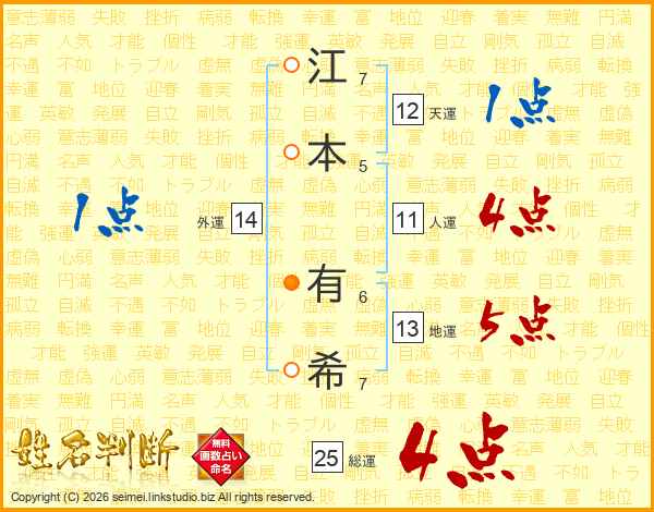 江(7画)本(5画) 有(6画)希(7画)