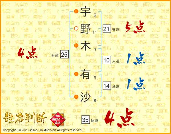 宇(6画)野(11画)木(4画) 有(6画)沙(8画)