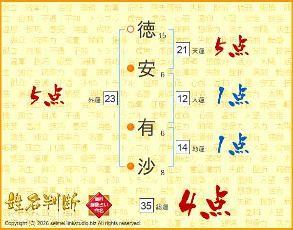 徳(15画)安(6画) 有(6画)沙(8画)