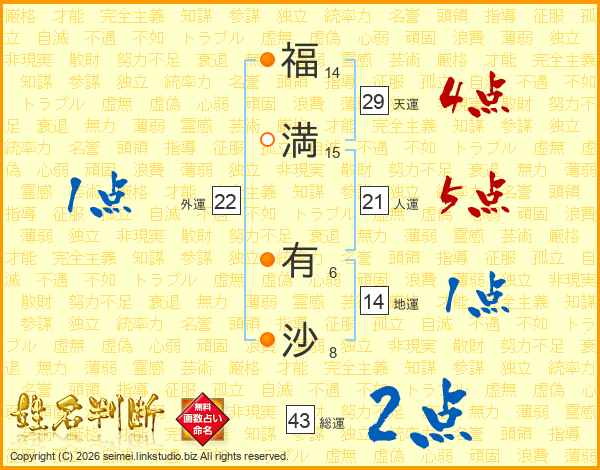 福(14画)満(15画) 有(6画)沙(8画)