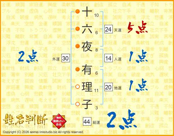 十(10画)六(6画)夜(8画) 有(6画)理(11画)子(3画)