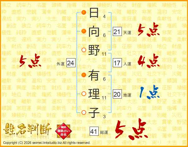 日向野有理子さんの総運は41画の5点!
