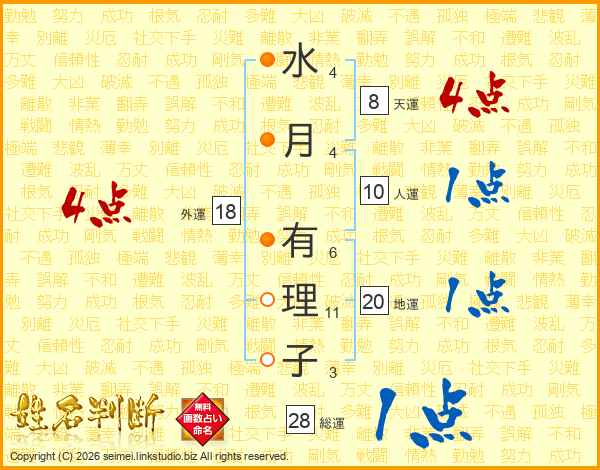 水(4画)月(4画) 有(6画)理(11画)子(3画)