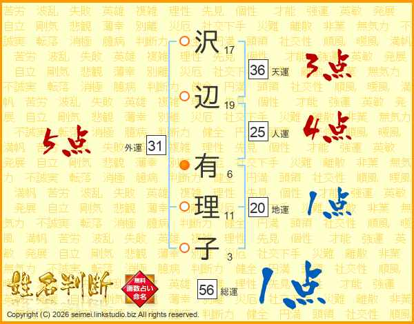 沢(17画)辺(19画) 有(6画)理(11画)子(3画)