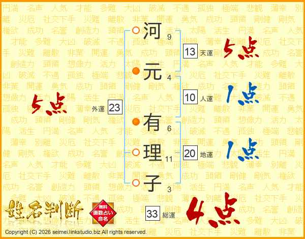 河(9画)元(4画) 有(6画)理(11画)子(3画)