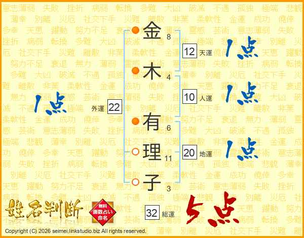 金(8画)木(4画) 有(6画)理(11画)子(3画)