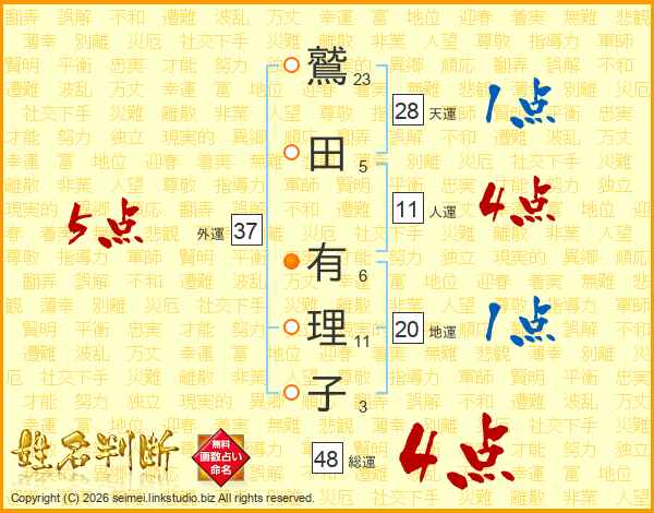 鷲(23画)田(5画) 有(6画)理(11画)子(3画)