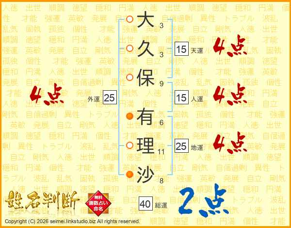 大(3画)久(3画)保(9画) 有(6画)理(11画)沙(8画)