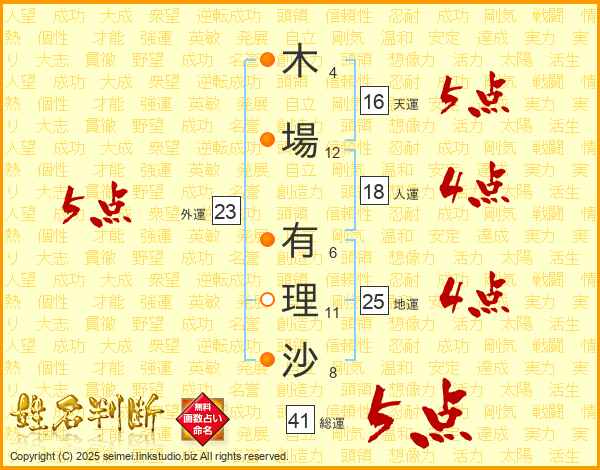 木(4画)場(12画) 有(6画)理(11画)沙(8画)