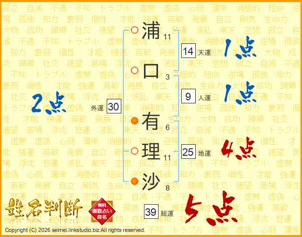 浦口有理沙さんの総運は39画の5点!