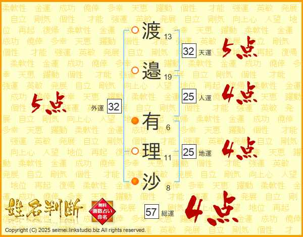 渡(13画)邉(19画) 有(6画)理(11画)沙(8画)