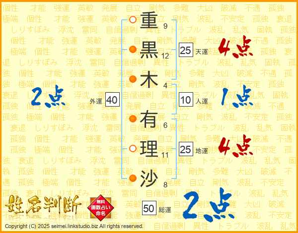 重(9画)黒(12画)木(4画) 有(6画)理(11画)沙(8画)