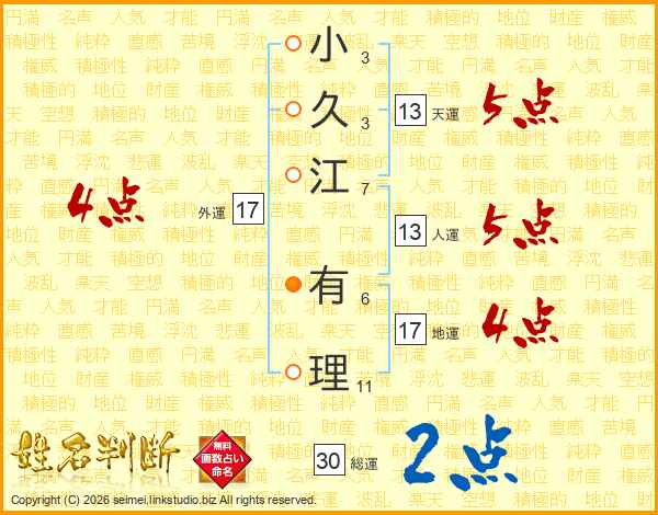 小(3画)久(3画)江(7画) 有(6画)理(11画)
