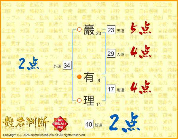 巖有理さんの天運は23画の5点!