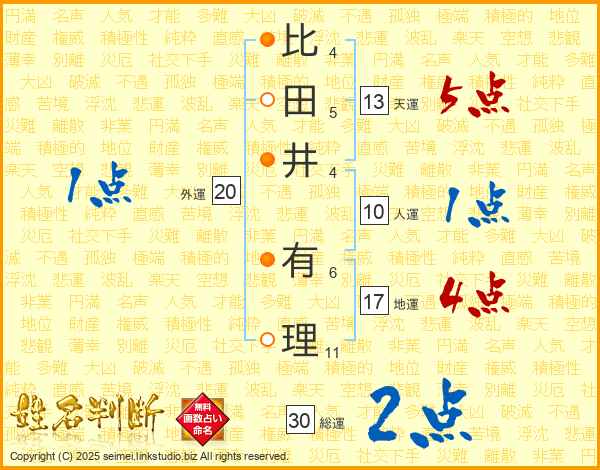 比(4画)田(5画)井(4画) 有(6画)理(11画)