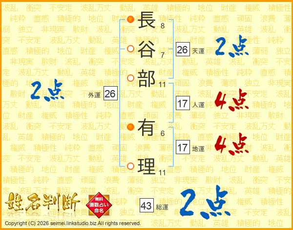 長(8画)谷(7画)部(11画) 有(6画)理(11画)