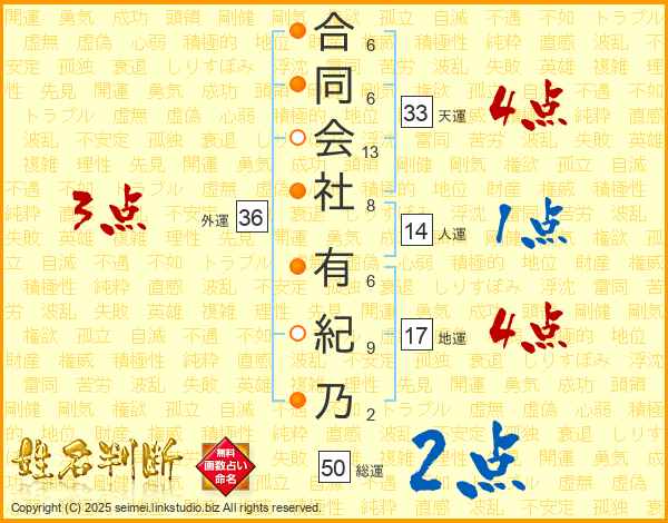 合(6画)同(6画)会(13画)社(8画) 有(6画)紀(9画)乃(2画)