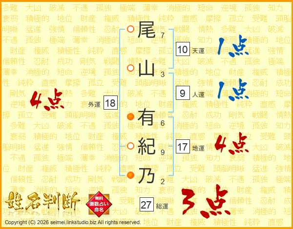 尾(7画)山(3画) 有(6画)紀(9画)乃(2画)