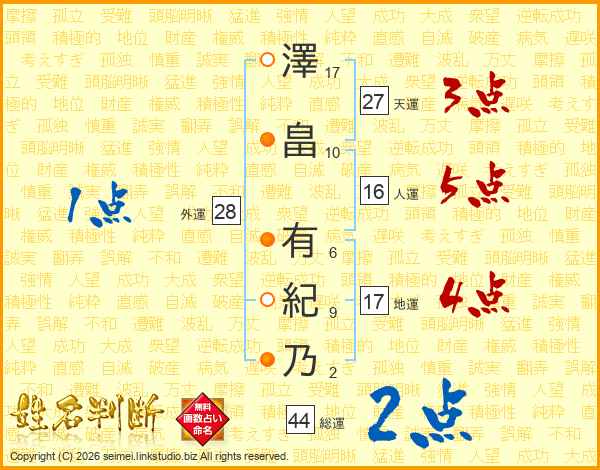 澤(17画)畠(10画) 有(6画)紀(9画)乃(2画)