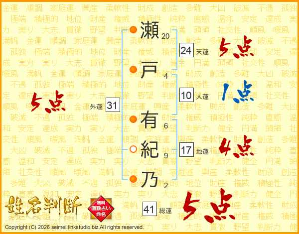 瀬(20画)戸(4画) 有(6画)紀(9画)乃(2画)