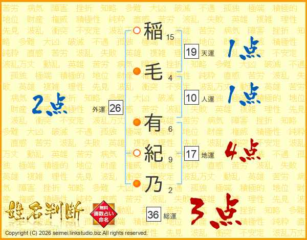 稲(15画)毛(4画) 有(6画)紀(9画)乃(2画)