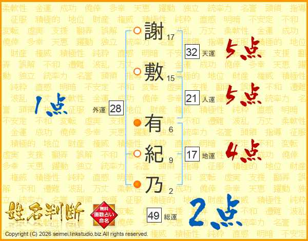 謝敷有紀乃さんの天運は32画の5点!