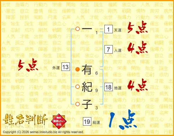 生活面を象徴する運勢です。外部から受ける影響力を表し、結婚運、家庭運や職場、環境への順応性を表します。総運から人運を引いた画数。姓や名が1文字の場合を除く。