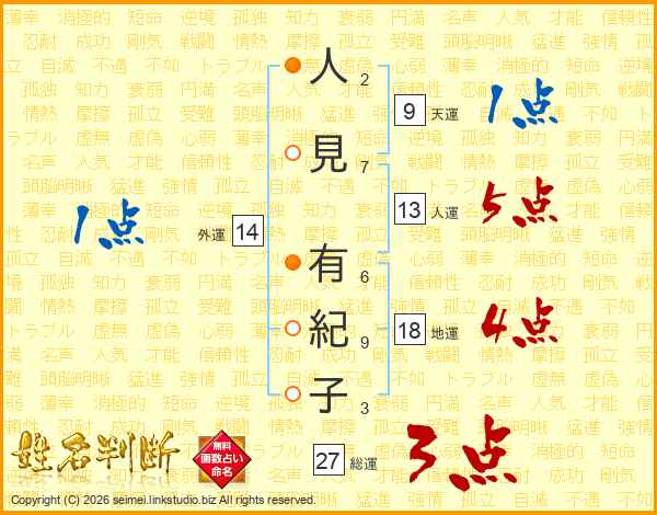 人(2画)見(7画) 有(6画)紀(9画)子(3画)