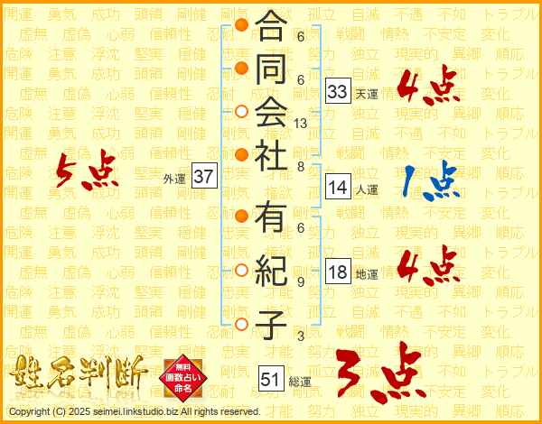合(6画)同(6画)会(13画)社(8画) 有(6画)紀(9画)子(3画)