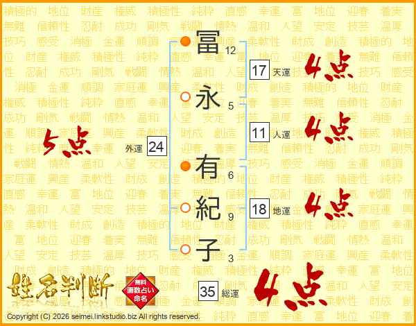 冨(12画)永(5画) 有(6画)紀(9画)子(3画)