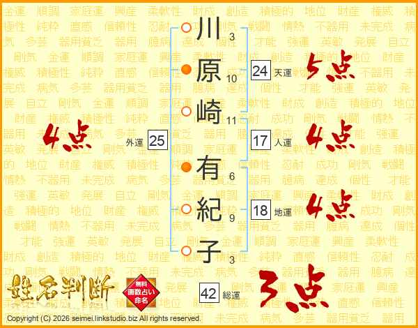 川(3画)原(10画)崎(11画) 有(6画)紀(9画)子(3画)