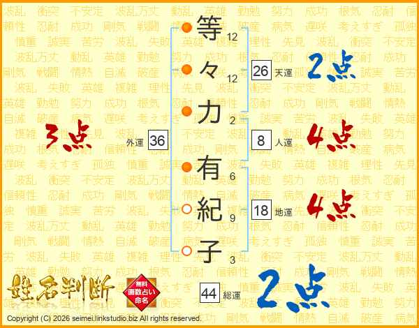 等(12画)々(12画)力(2画) 有(6画)紀(9画)子(3画)