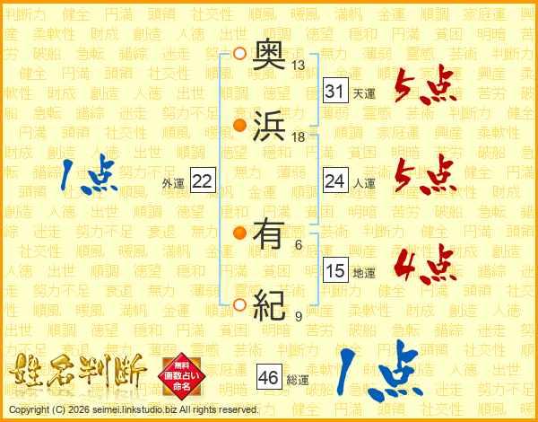 奥(13画)浜(18画) 有(6画)紀(9画)