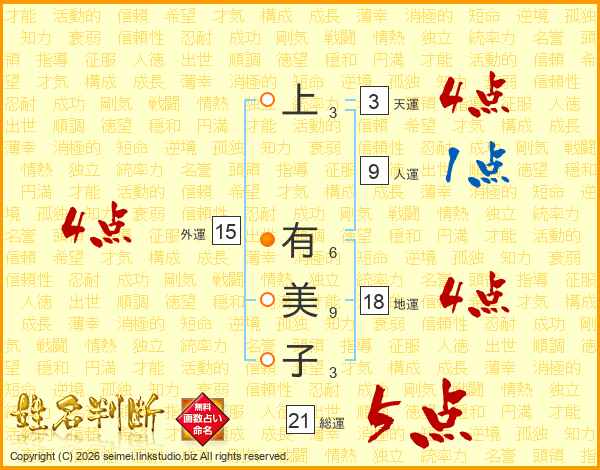 生活面を象徴する運勢です。外部から受ける影響力を表し、結婚運、家庭運や職場、環境への順応性を表します。総運から人運を引いた画数。姓や名が1文字の場合を除く。