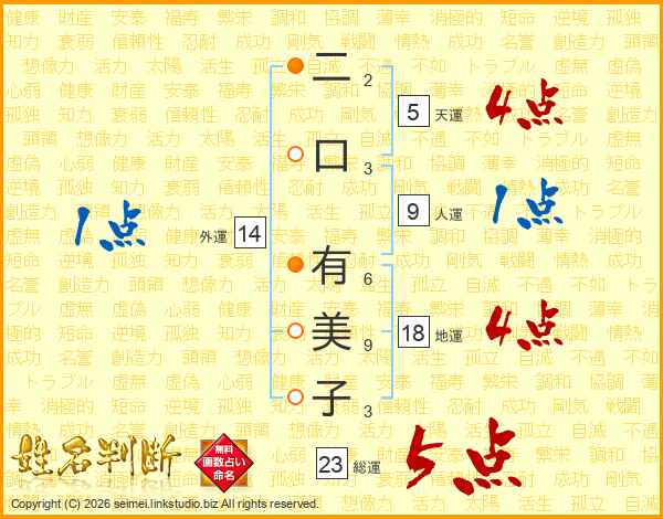 二(2画)口(3画) 有(6画)美(9画)子(3画)