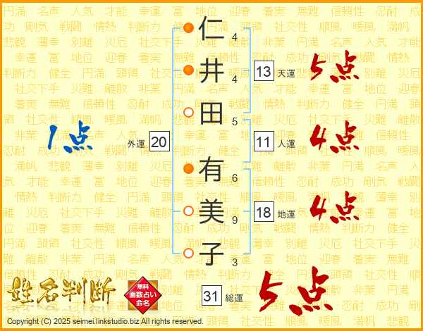 仁(4画)井(4画)田(5画) 有(6画)美(9画)子(3画)