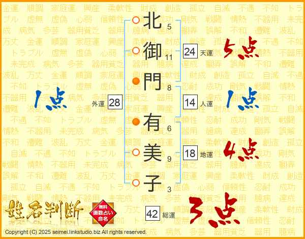北(5画)御(11画)門(8画) 有(6画)美(9画)子(3画)
