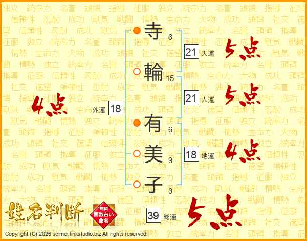 寺(6画)輪(15画) 有(6画)美(9画)子(3画)