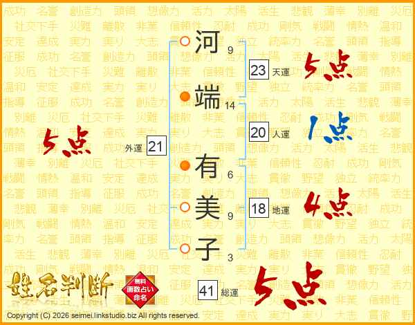 河(9画)端(14画) 有(6画)美(9画)子(3画)