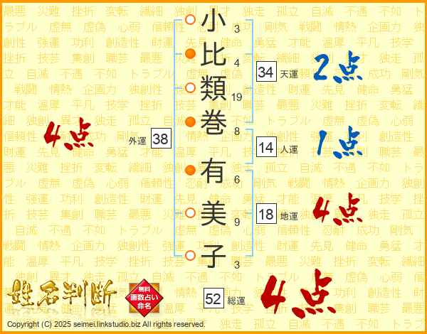 小(3画)比(4画)類(19画)巻(8画) 有(6画)美(9画)子(3画)