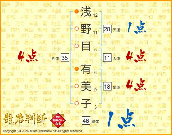 浅(12画)野(11画)目(5画) 有(6画)美(9画)子(3画)