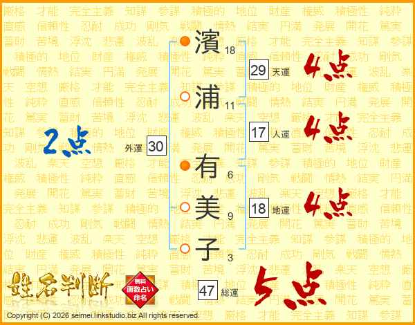 濱(18画)浦(11画) 有(6画)美(9画)子(3画)