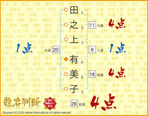 田(5画)之(3画)上(3画) 有(6画)美(9画)子(3画)