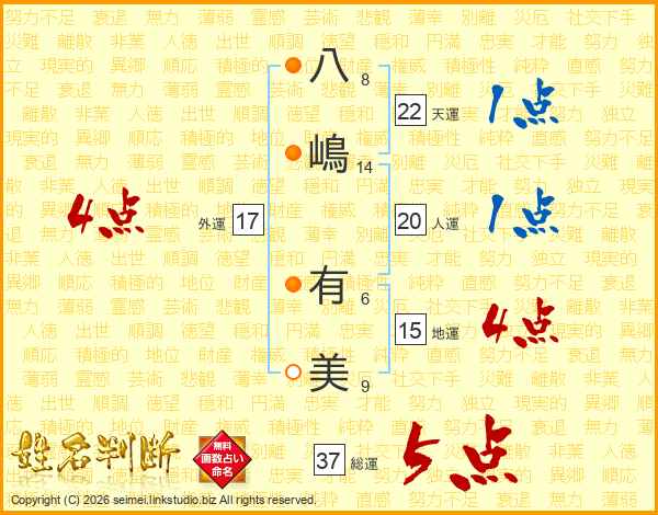 八(8画)嶋(14画) 有(6画)美(9画)