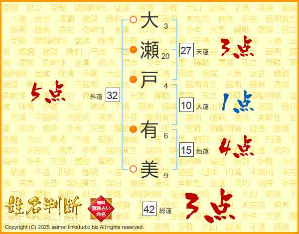 大(3画)瀬(20画)戸(4画) 有(6画)美(9画)