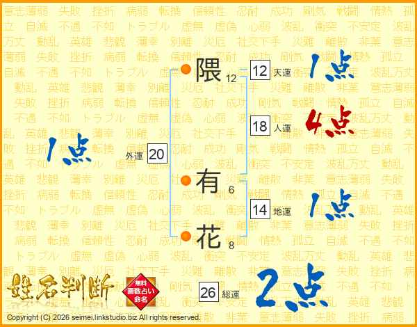 生活面を象徴する運勢です。外部から受ける影響力を表し、結婚運、家庭運や職場、環境への順応性を表します。総運から人運を引いた画数。姓や名が1文字の場合を除く。