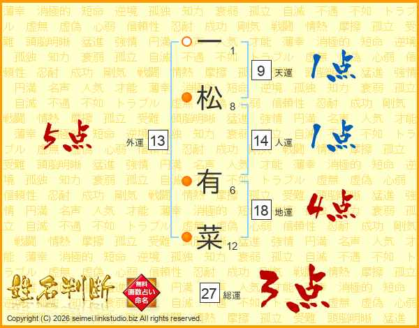 生活面を象徴する運勢です。外部から受ける影響力を表し、結婚運、家庭運や職場、環境への順応性を表します。総運から人運を引いた画数。姓や名が1文字の場合を除く。