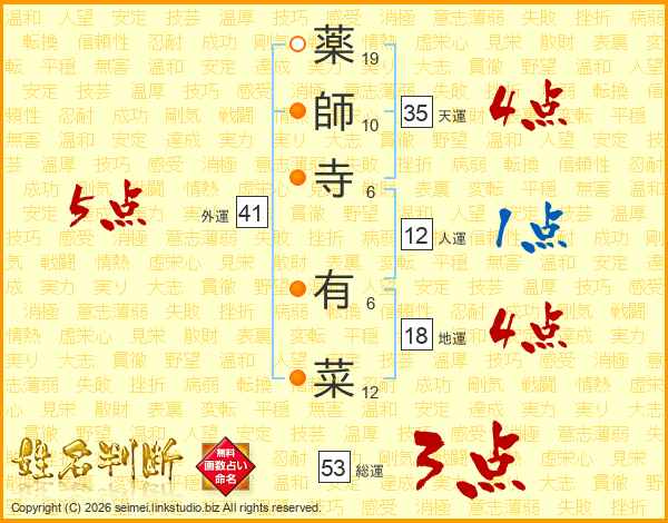 薬師寺有菜さんの総運は53画の3点!