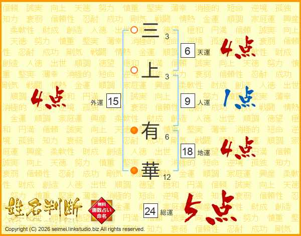 生活面を象徴する運勢です。外部から受ける影響力を表し、結婚運、家庭運や職場、環境への順応性を表します。総運から人運を引いた画数。姓や名が1文字の場合を除く。