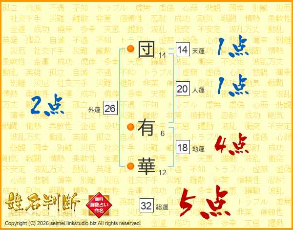 団(14画) 有(6画)華(12画)
